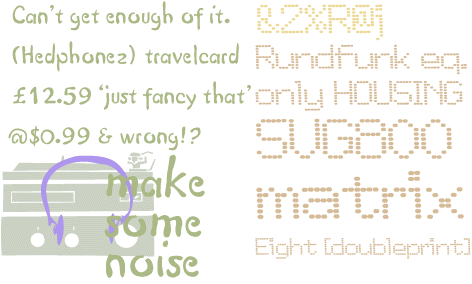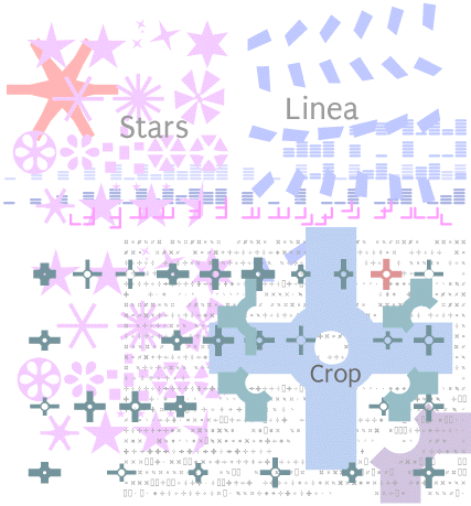 I’ve drawn several other typefaces for various reasons. There’s Crop, which is a set of shapes loosely based on the cropmarks which printers use to cut down sheets of paper to size (they look a bit like targets, and may symbols reflect this). Eight is a set of three dot-matrix style faces meant to mimic cash register printouts. Stars is a collection of star-ish shapes. Linea is an alphabet of abstract rhombuses rotated in 20-degree steps. Hedphones was drawn for a short-lived record label, and mimics blobby, overinked handwriting.